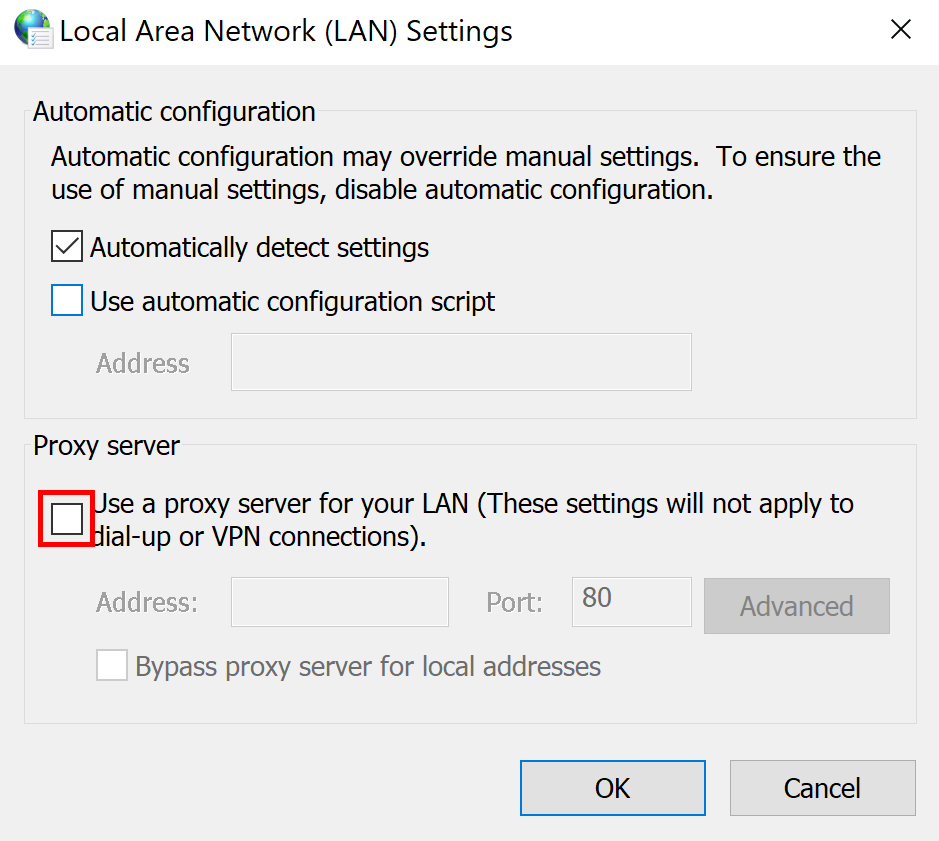 - Desmarque a caixa de seleção Usar um servidor proxy conforme ilustrado abaixo: